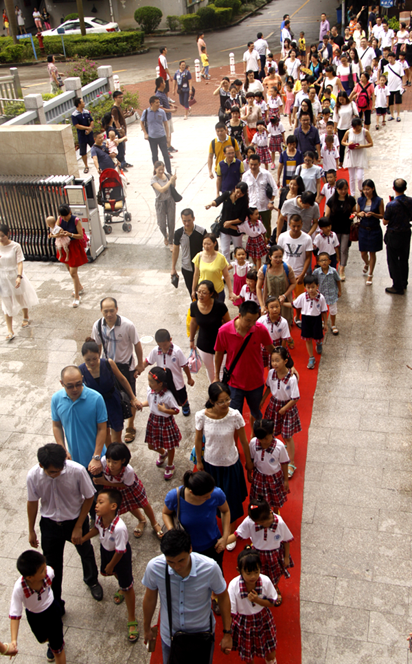 学生在家长的带领下走红毯、越“龙门”