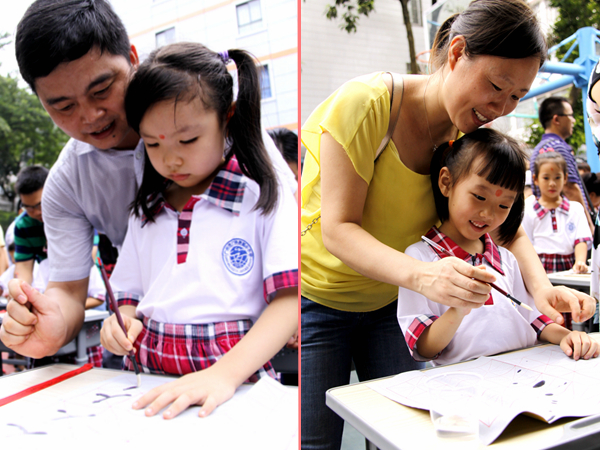 学生在家长的教导下开笔