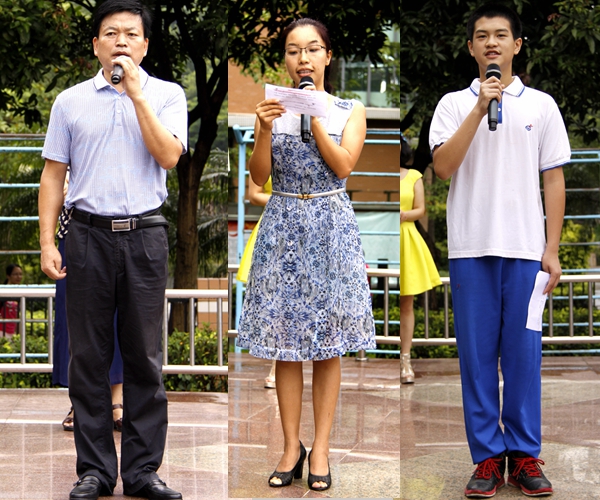 校长吴玉爱、教师代表刘瑞、学生代表邝轩安分别演讲
