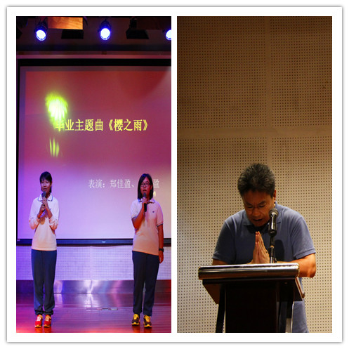 接着,郑佳盈、蒋可盈两位同学用歌声表达了对初中生活留恋和对学校的热爱。同时,初三6班温丰荧同学的家长也代表全体家长讲话,他在讲话中提到感恩学校提供了这么好的教育和学习的氛围,感恩各位老师给予了孩子们这么多的关爱和关注,感恩家长对学校和学生的关心和支持,感恩孩子们自己的不断成长!