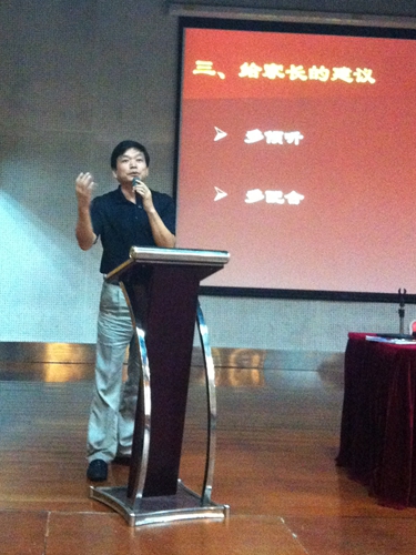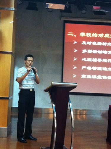 涂副校长作了《创优秀年级——把握“特点”有效应对》的报告,报告主要谈到初二年级整体变化、学生个性的变化,如集会质量高,活动的效果好,学生的竞争意识强等。对于学校的管理措施,谈到及时表扬树立正气,开展多彩活动培育自信,严格管理确立规矩,保证高效课堂效率,注重分层辅导及时巩固,注重学生的心理辅导及时护航等,同时给家长建议多倾听孩子的心声,多配合学校的工作。