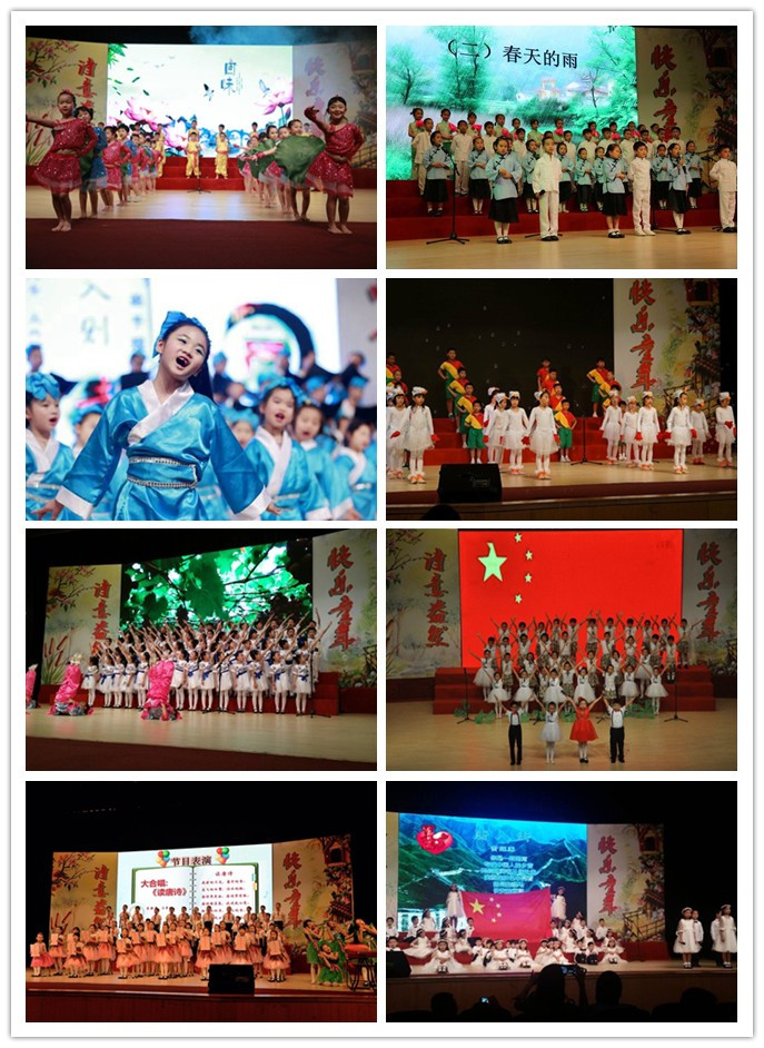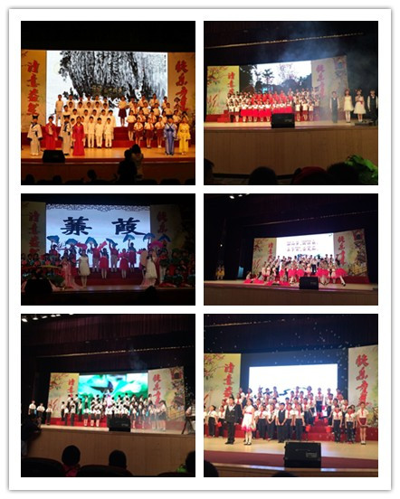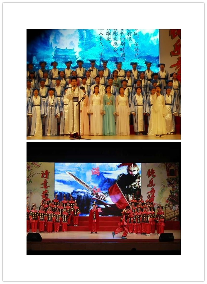 活动中,同学们的表演集歌、舞、吟、诵、独白、评述、齐唱等于一体,多角度地演绎了中华经典,弘扬民族文化。各班参赛同学用心灵来吟唱,用真情来演绎。小一(1、5、6)班《弟子规》、小三年级《读唐诗》、小五(3、4)班《三字经》分别展示了中华悠久文化的独特魅力;小一(2)班《江南》、小二(1)班《唱响江南情》引领大家进入烟雨江南品味梦里中国第一水乡;小一(3、4)班《我爱春天》、小四(2、4)班《春天的诗情》吸引我们尽情地想象那莺歌燕舞、百花齐放的烂漫春光;小四(1、3)班《千骑卷平冈》、初一(3)班《满江红》读来气势磅礴,让人充分感受到一代英雄忧国忧民的无尽情怀感情激奋,读之可养志;小二(5)班《童心邀明月》、小六(1、2)班《中华少年》、小六(3、4)班《我爱你,中国》、小三年级《最是故乡家国情》表达了孩子们身为中国人的自豪感与强烈的爱国热情;小二(2、3、4)班《明日歌》、初二(4)班《水调歌头》、小五(1、2)班《蒹葭》揭示睿智的人生理念,达到了人与宇宙、自然与社会的高度契合。