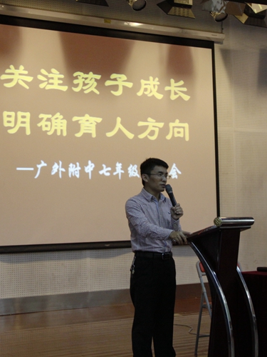 会议由初一年级组长张晓鹏老师主持。大会一开始,张级长首先用图片、文字向家长们展示了学生在学校近半个学期的学习、生活情况,在此,向家长们传达了这个过程中孩子的成长收获,学校的活动育人理念,并给出了反思和建议。