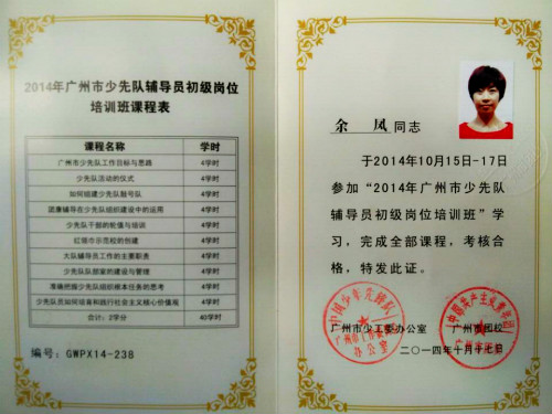 本网讯为进一步落实少先队组织建设任务,加强少先队工作的专业性和连续性,提高少先队辅导员的理论水平和工作实践能力,10月14——17日,由全国少工委和广州市团校联合举办的少先队辅导员初级培训班在广州市团校开班。省团校副校长、志愿者学院院长唐勇,青少年研究所、广州青年发展中心魏晓丽部长及广东省总辅导员顾问刘超英等出席开班仪式,我校少先队大队辅导员余凤老师参加此次培训。