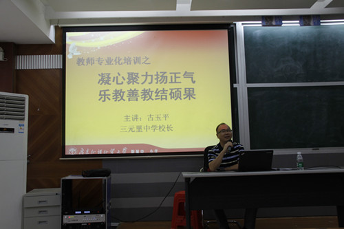 本网讯10月22日下午,三元里中学校长古玉平来我校面向全体教师做“怎样提高课堂教学效率”的讲座。讲座由教学处林旭丽主任主持,吴玉爱校长、涂筱辉副校长及全体中学教师聆听了此次讲座。