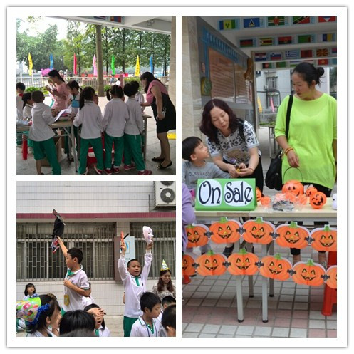 三年级和五年级主打万圣节礼品、装饰品,口号响亮整齐,卖场气势壮观,热闹非凡,全英叫卖: