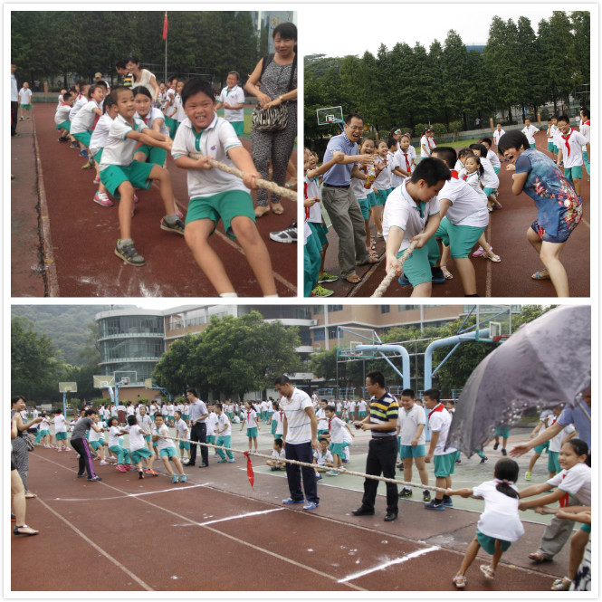 瞧,这边的加油声此起彼伏,原来是四年级的学生在进行的拔河比赛,队员们个个使足了劲,小脸涨得通红,团结一心拧成一股绳;其他的同学则激动地喊着“加油”,引来了一位又位观众驻足围观。