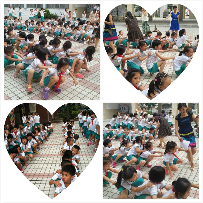 “哇,好大一条虫在爬”,原来,是小学二年级的同学在玩千足虫的游戏,一队列的学生蹲下来,后面的同学搭在前面同学的肩膀,慢慢地往前摊动,简直就像极了一条正爬行大虫子。