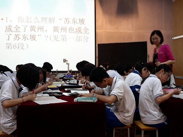 本网讯5月13日下午,学校礼堂举行初中语文教研活动。校内名师吴冠仪老师为中学全体老师展示了一节精彩的语文示范课——《〈苏东坡传〉阅读分享》。