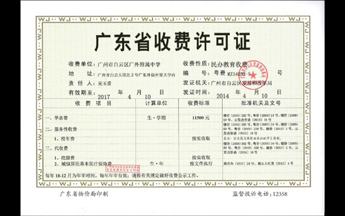 根据《中华人民共和国民办教育促进法》,省物价局、省教育厅《广东省物价局广东省教育厅关于规范我省民办中小学校教育收费管理的通知》(粤价〔2009〕59号)和广州市有关文件,白云区发展和改革局对我校2014年秋季入学新生的有关收费做了批复。据了解,学杂费实行“新生新办法、老生老办法”的原则,即此前入学的学生,按原收费标准执行。目前学校已按有关规定办理了《广东省收费许可证》,从2014年秋季新生进校起执行新学杂费标准,原在校学生仍按原收费标准执行直到毕业。(办公室)