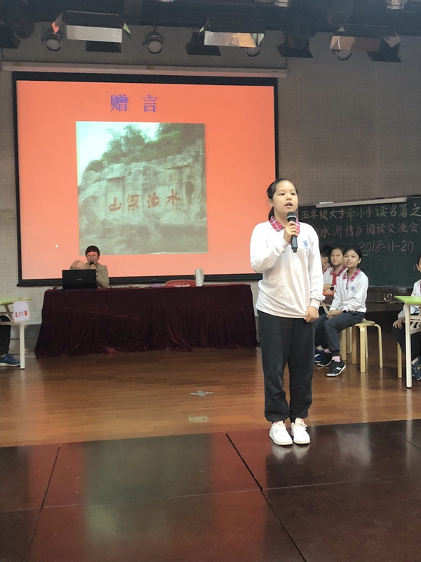 交流会分为名著导读、阅读分享、知识竞赛、观众互动四个环节。全体学生高声齐唱《好汉歌》,声音响彻云霄,气贯长虹,在激荡人心的氛围中,交流会拉开了帷幕。首先,范秀红老师为同学们介绍了《水浒传》这部巨著的作者以及故事梗概。紧接着,五(4)班的“水浒小达人”植宁博同学闪亮登场,和大家一起分享了他阅读《水浒传》的感受及阅读方法。