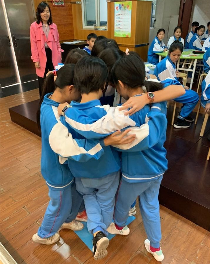 接下来是初一(4)班题为“我爱我班”的展示。他们的班会充满了活跃的气氛。现场的一个游戏更是让气氛达到高潮:每组六个人要共同站在一张A3纸上保持10秒。为了不摔倒,学生们必须搂在一起。通过这个游戏来让大家体会带团结的力量。班会尾声,同学们更是当场给各位观看的老师发便利贴,让老师们写下对4班的要求和期望。