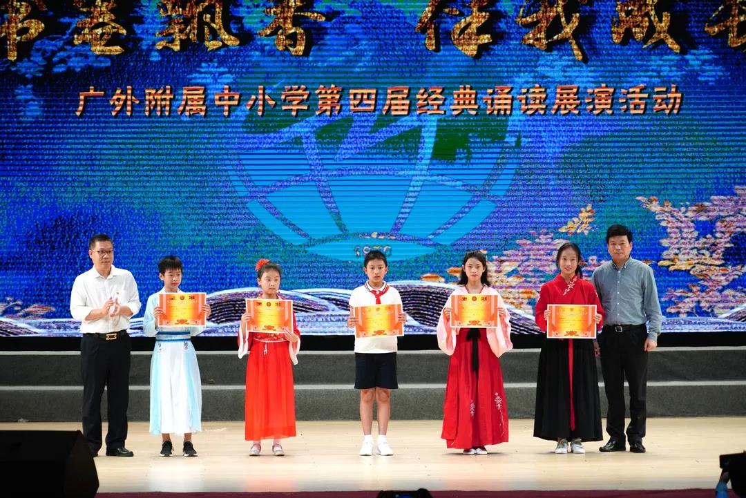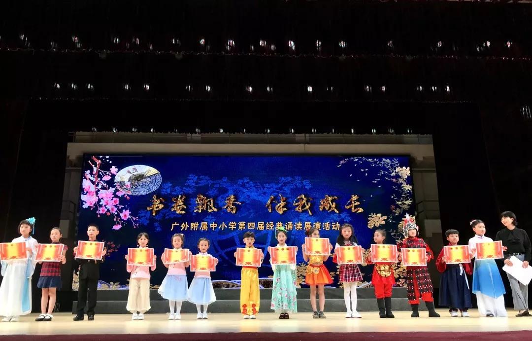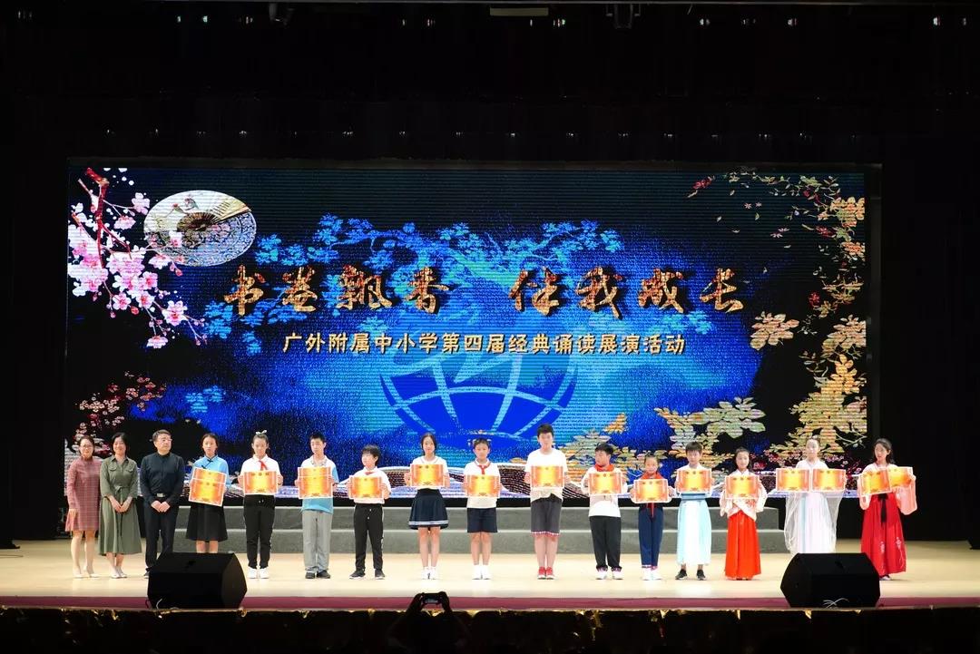 本网讯 享读书快乐,品诗词美韵。4月23日,我校 “书卷飘香,伴我成长”第四届经典诵读展演在广外云山会堂隆重举行。近2000名附校学子品读优美诗词,领略国学经典,通过吟、诵、唱、舞等活泼新颖,特色鲜明,不拘一格的表演,诠释了国学经典作品的内涵。