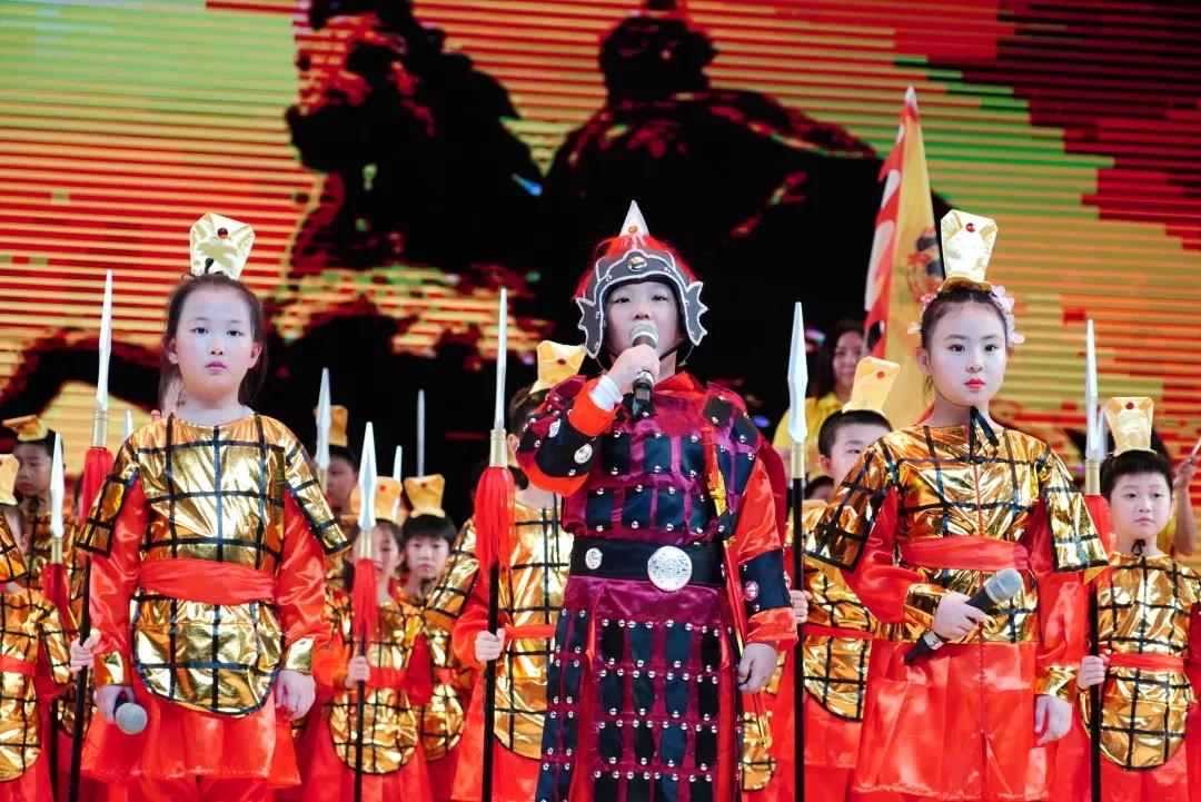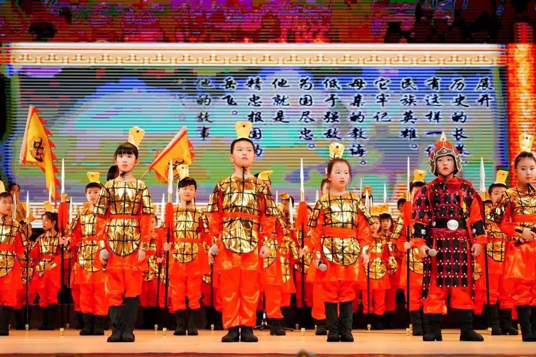 三1、三5班《满江红》身着黄金战甲的学生演绎岳飞精忠报国,霸气豪迈,深藏身与名,一曲高歌,热血沸腾。