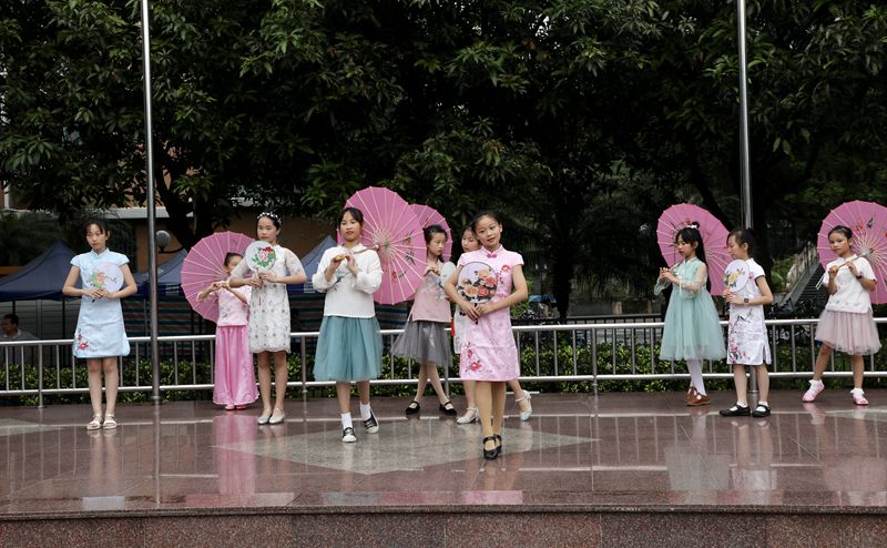9:40,广府文化展暨美食节开始了,大操场上各班家长早已为孩子们布置好了美食大本营。放眼望去,五颜六色的帐篷好似一道色彩缤纷的虹。孩子们兴奋地拿出自己和家长精心准备、亲手制作的美食,热情邀请经过的大朋友小朋友们来品尝,整个操场美食飘香。与此同时,伴随着粤语童谣欢唱,鸡公揽走街串巷,身着精美旗袍的美女妈妈们为大家奉上新沏的茶,各种粤式点心,糖水,让人眼花缭乱,目不暇接。孩子们尽情地吃,尽兴地玩,同时也在广府文化的氛围里浸染着,校园沉浸在一片欢乐的海洋中。