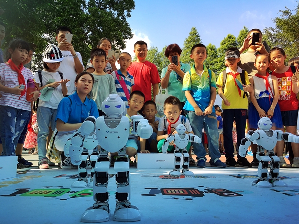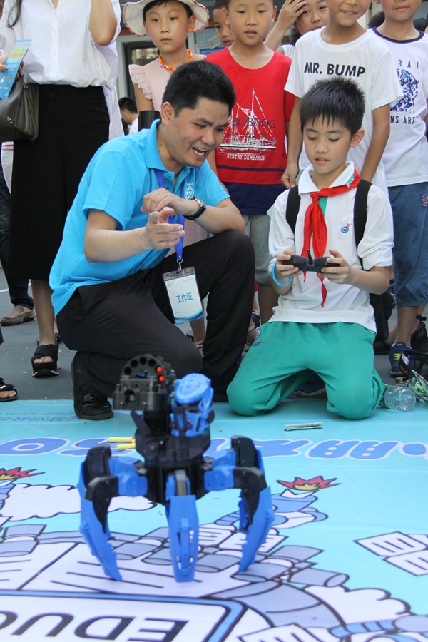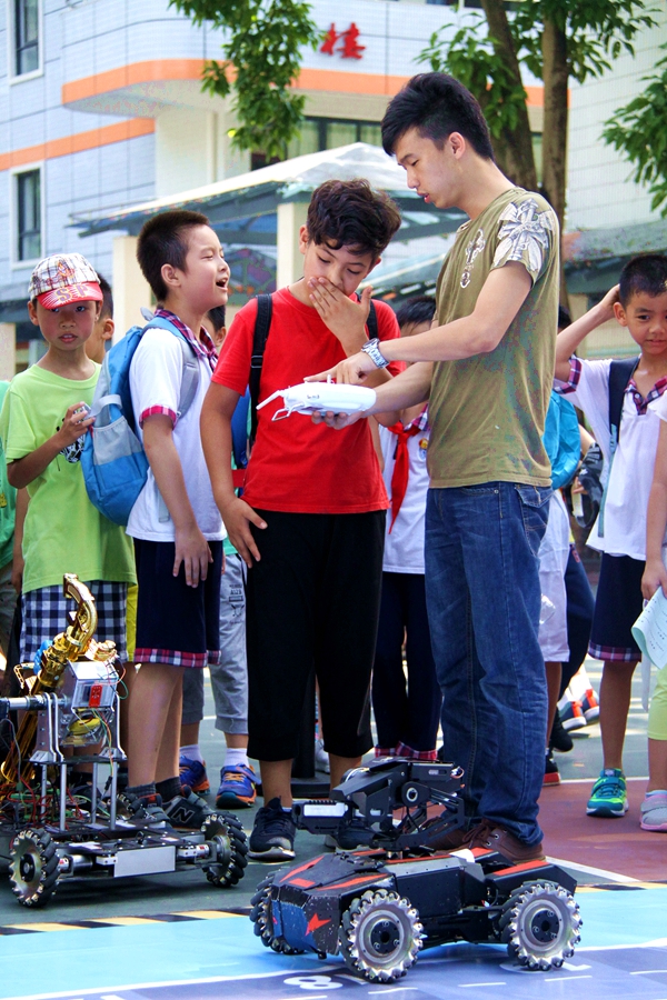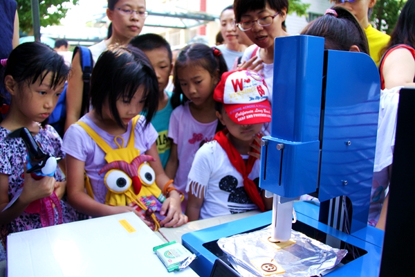 在科技展示区有无人机、VR体验、3D打印、未来教室、机器人体验、人机交互体验、PS4体感游戏等7个科技体验项目,孩子们爽朗的欢笑声和此起彼伏的赞叹声飘荡在明媚的阳光下,到处洋溢着欢乐的节日气氛。看“阿尔法”春晚跳舞机器人、3D打印机“吐出”一块块精美的巧克力、LEGO NXT2.0机器人与魔方机器人等科技小制作作品引人注目。体验区,五轴机械臂、遥控空中飞鱼、VR虚拟现实体验,令人眼花缭乱;手势控制夹娃娃机、与3D打印机器人猜拳,寻迹车与漂移自动射击车;弹奏“电子键盘”、做“冰激凌”、设计“3D模型”忙得不亦乐乎。最精彩的“无人机”伴随着微微凉风,直飞半空,爆发力十足,引起学生们阵阵惊呼声与掌声……