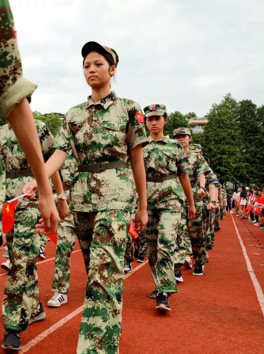 刚结束军训的初一、初二学生给师生们展示了军训成果——擒敌拳,同学们身着迷彩服,个个精神抖擞,出拳“快、狠、准、稳”,展现出附中学子健康乐观、积极向上的风貌。