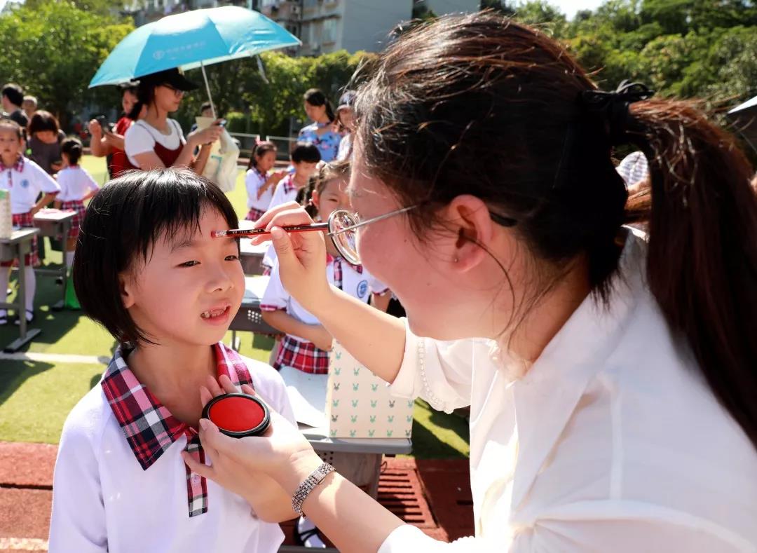 “朱砂启智”寓意开启智慧,从此眼明心亮,发奋读书。学校领导和一年级教师在每个学生的额头上点上“朱砂痣”,祝福他们开启智慧之眼,从此耳聪目明,茅塞顿开。
