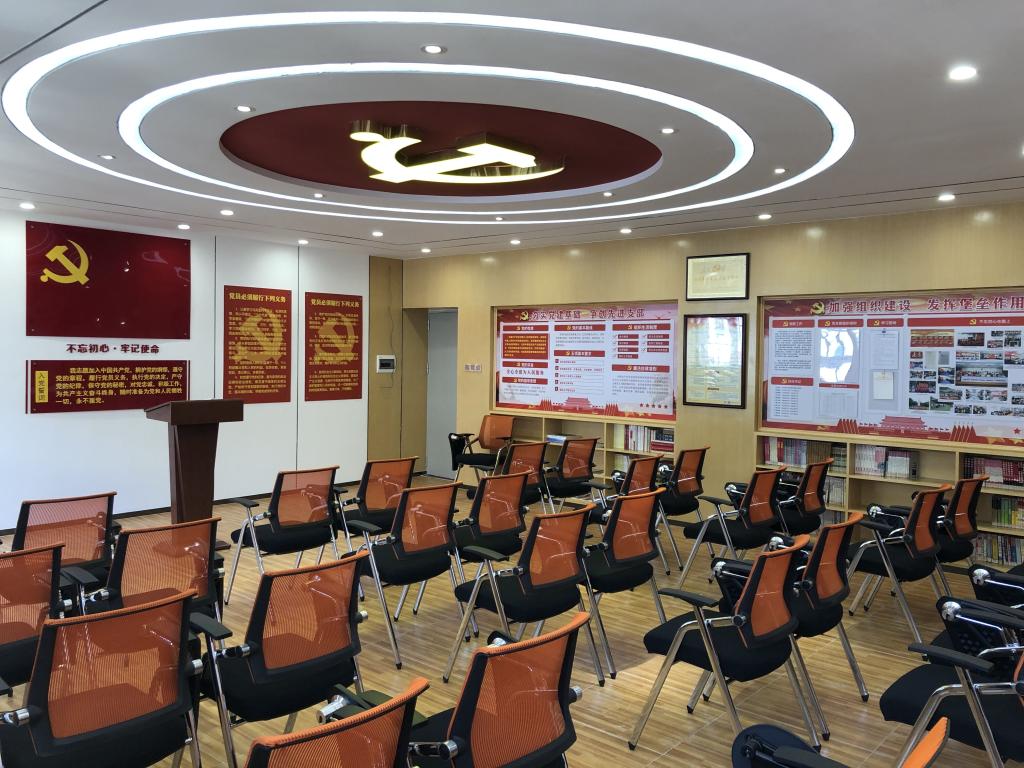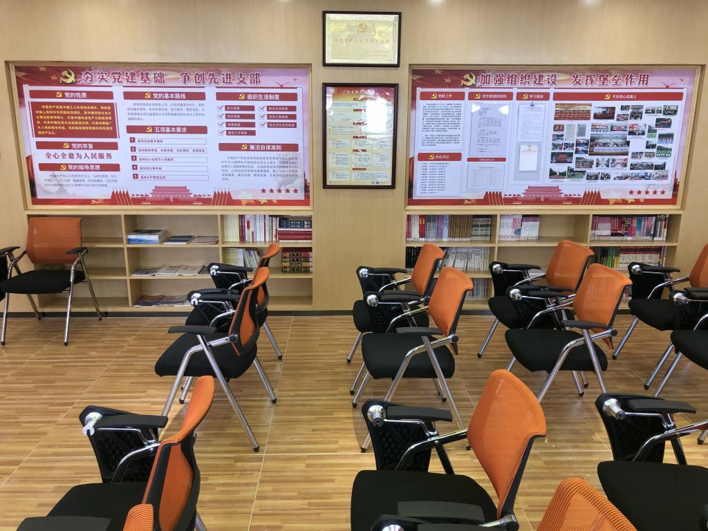 “初心驿站”装饰设计中配有党徽、长城、天安门等标识和元素,以红、黄两色为基准,墙面设有“组织架构”、“学习园地”、“支部风采”、“党费缴交公示”等,同时,配置了一定数量的书籍,为党员、群众提供了一个良好的活动阵地和学习环境,进一步发挥党建带群建的作用。