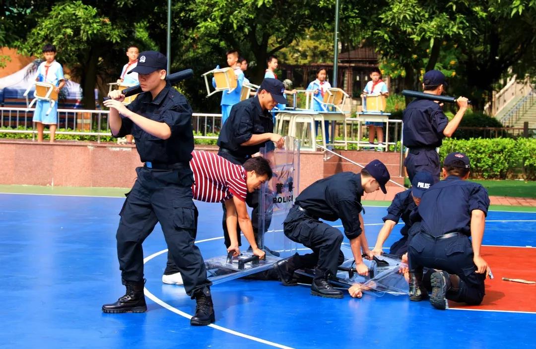 一位“暴徒”闯进校园,试图“砍杀”学生,同学们快速远离“暴徒”并大声呼救,学校护卫队闻声出动,钢叉、盾牌齐上阵,武警官兵也随即抵达现场,最终“暴徒”被制服。