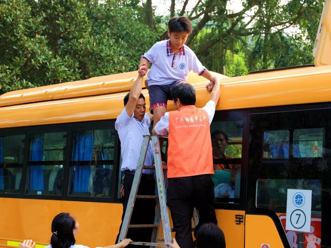 当得知还有3名学生正在校车上被大火包围无法撤离时,司机和跟车老师迅速指导学生利用破窗锤破窗处置,学校也组织了有关人员赶到校车,打开车顶窗口逃生通道,立即进行紧急有序撤离……