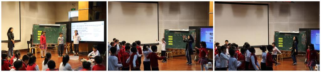 首先,我校小学部三年级周群老师给大家上了一堂英语戏剧展示课。周老师先从一首动感十足的音乐舞蹈开始热身,接着利用“Mirror game”让学生相互表演、模仿,融洽了课堂气氛,为后面的课做了良好的铺垫。随后,周群老师邀请了三大组同学,对上堂课学过的绘本故事“Tidy up the toys”进行了表演,并引导学生从四个方面“intonation, expression, body movement, teamwork”进行评价。最后,也是这节课升华部分,周老师先从喜怒哀乐的表情和动作,对学生进行了引导表演,然后孩子们上台模仿父母在家的各种情绪和表现。孩子们的表演能力及语言功底,赢得了在座听课老师的阵阵掌声!众听课老师对周老师的这节戏剧课给予了高度评价,认为这是非常好的一堂戏剧课范本,对日后怎样开展英语戏剧课很有参考价值。