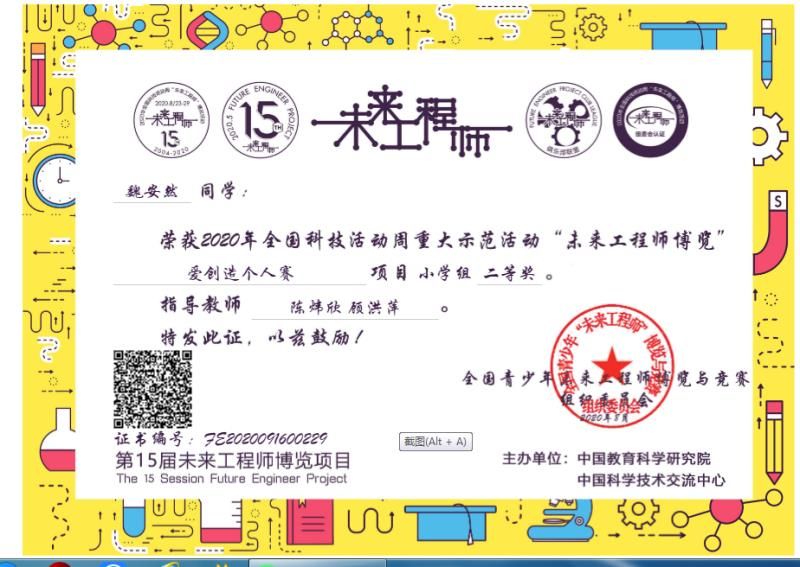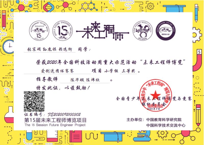 由中国教育科学研究院、中国科学技术交流中心主办的2020年全国科技活动周重大示范活动“未来工程师博览”之“爱创造”项目中荣获一等奖、二等奖、三等奖共计12项。
