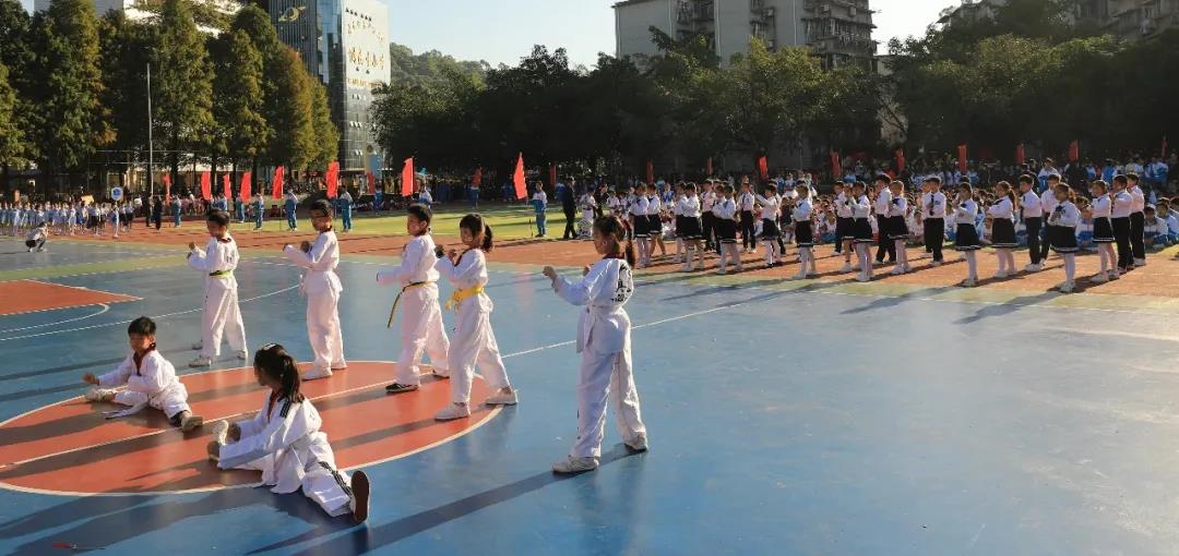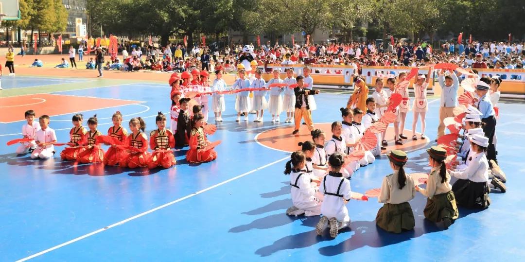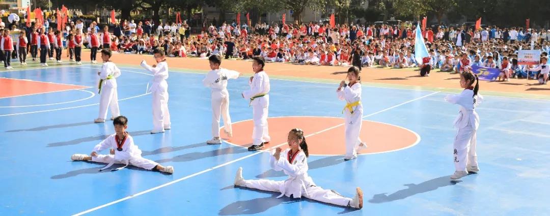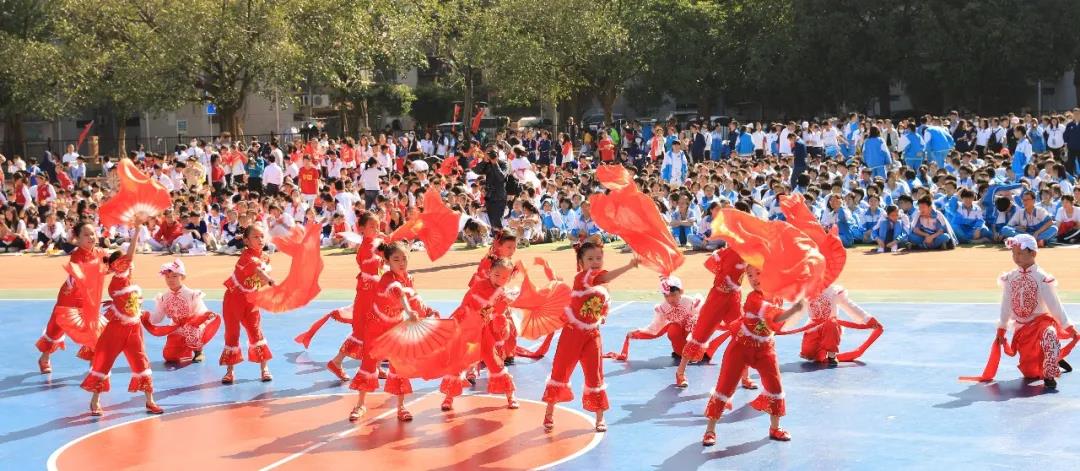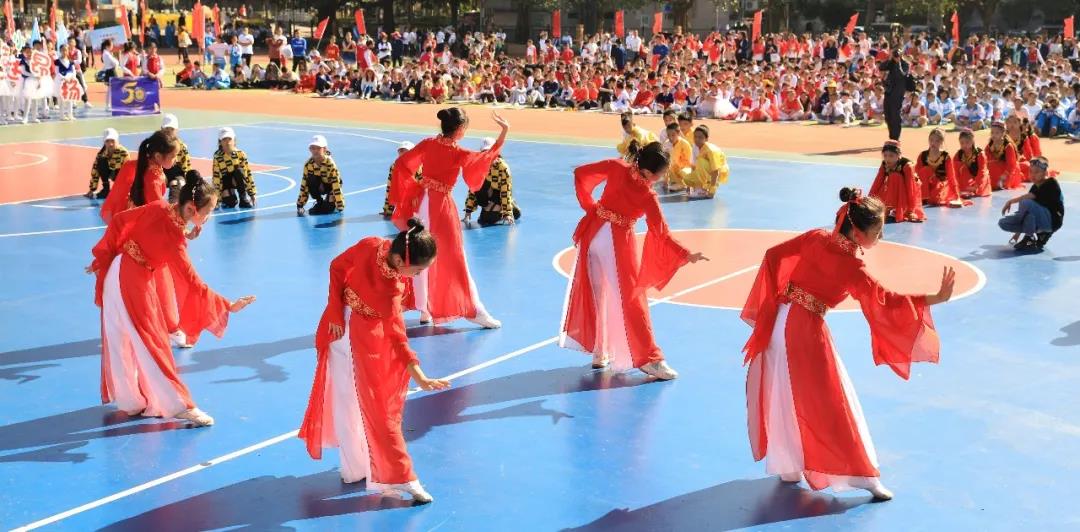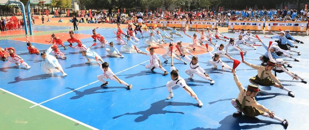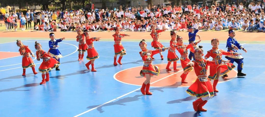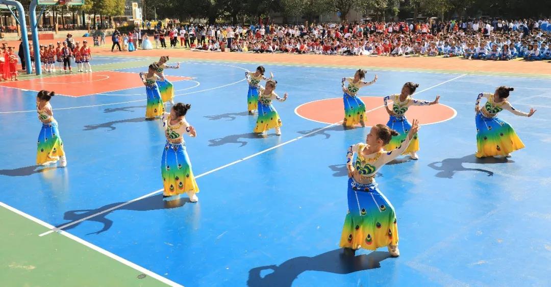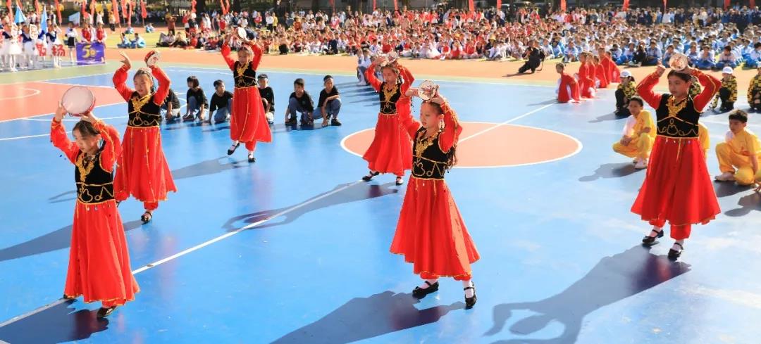 五年级组婀娜多姿的新疆舞和中华武术开场,街舞少年和古风少女一起演绎着我运动,我健康,做身心健康全面发展的学生。