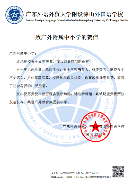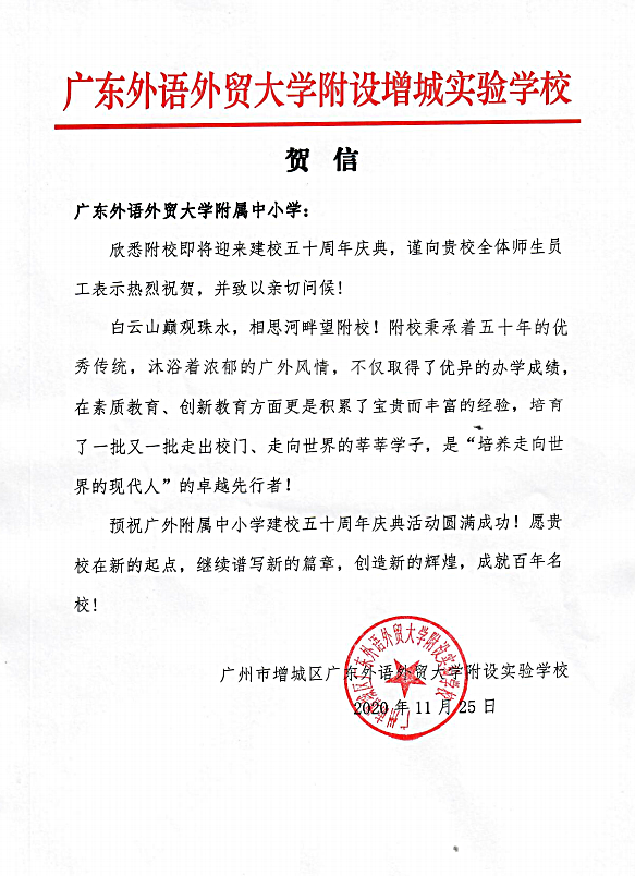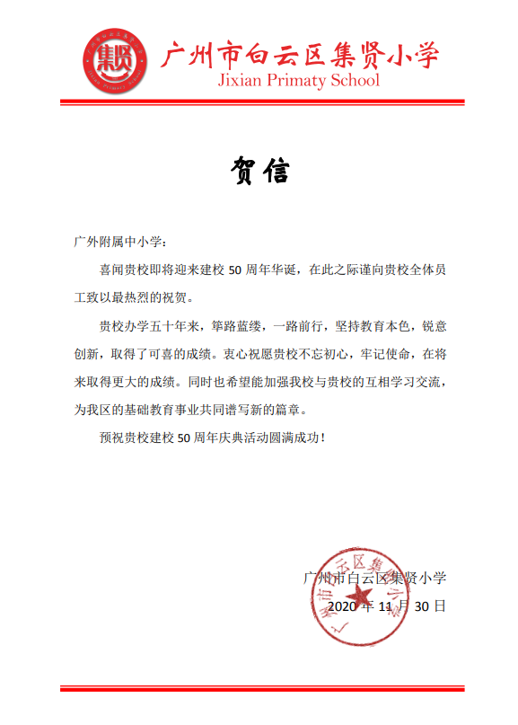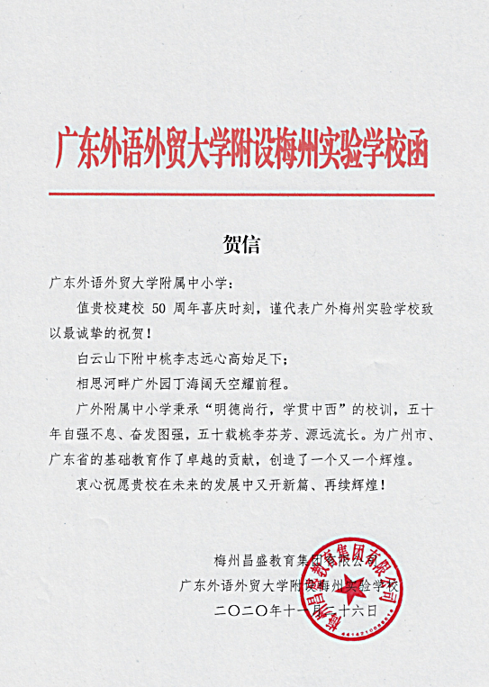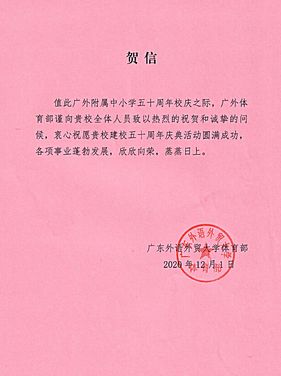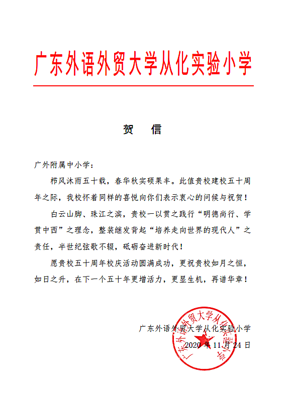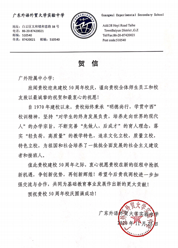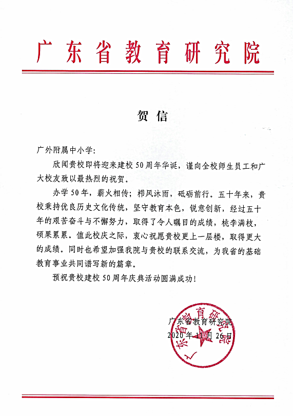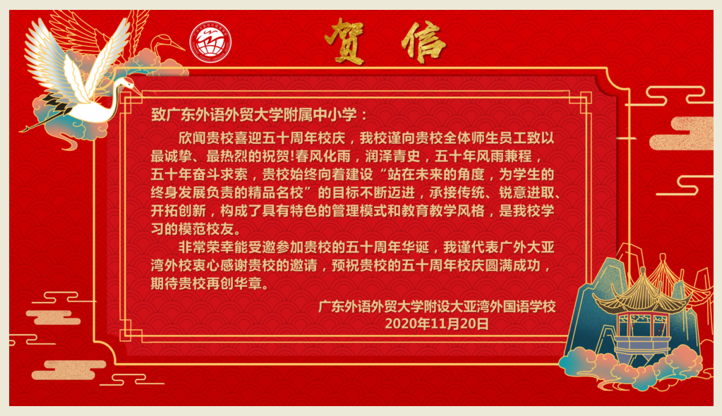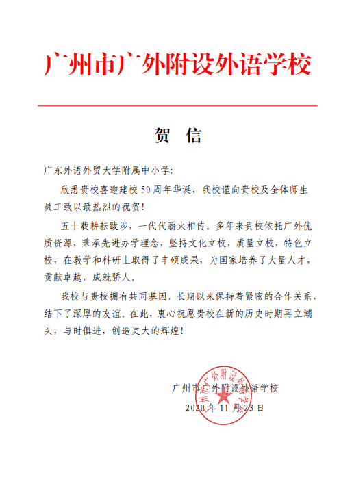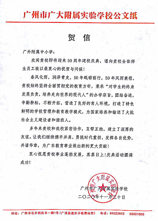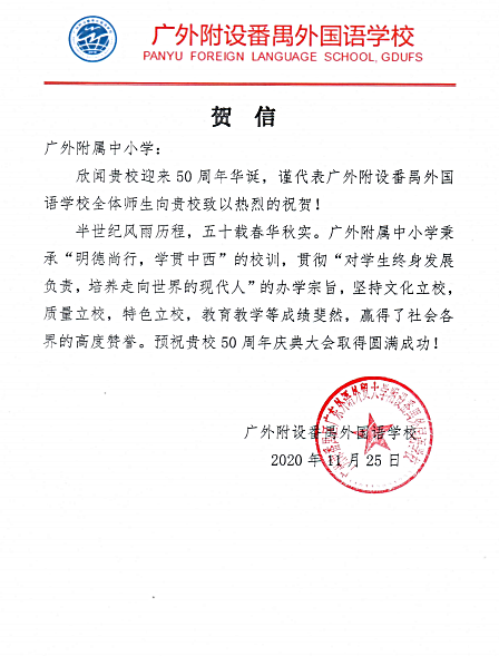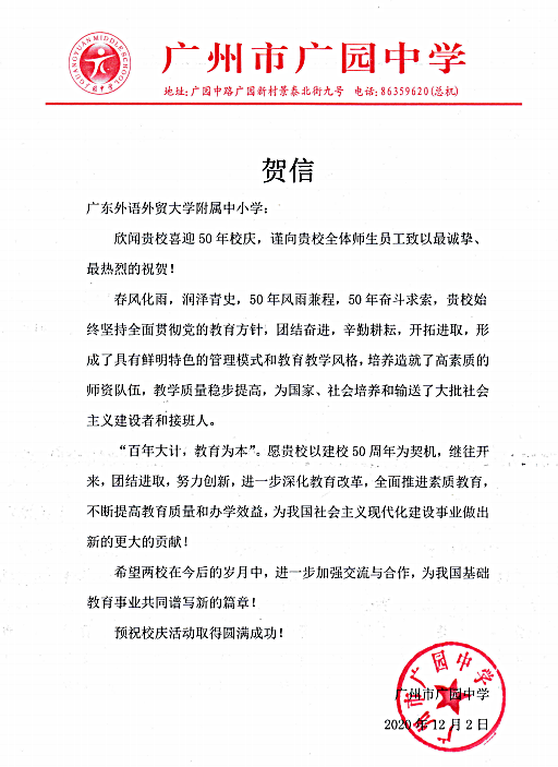 在过去的50年里,广外附属中小学得以持续稳健发展,不仅依靠全体员工的耕耘和付出,还离不开各级领导的亲切关怀和社会各界友好单位的大力支持。值此50周年校庆之际,前来学校祝贺的领导、友好单位、热心人士络绎不绝。