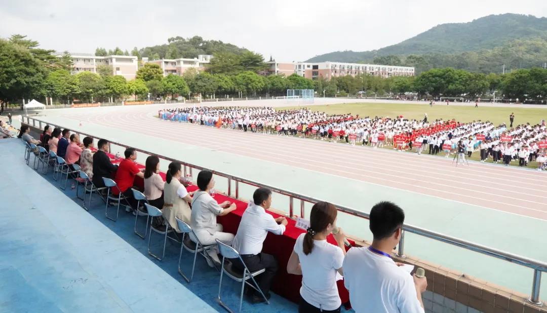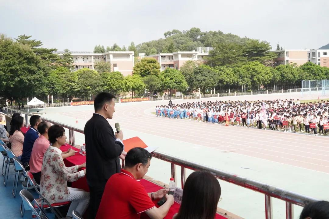 运动员代表六2班闫子悦同学和裁判员代表陈豪钦老师分别进行会前宣誓。方建军校长宣布第46届校运会正式开幕。