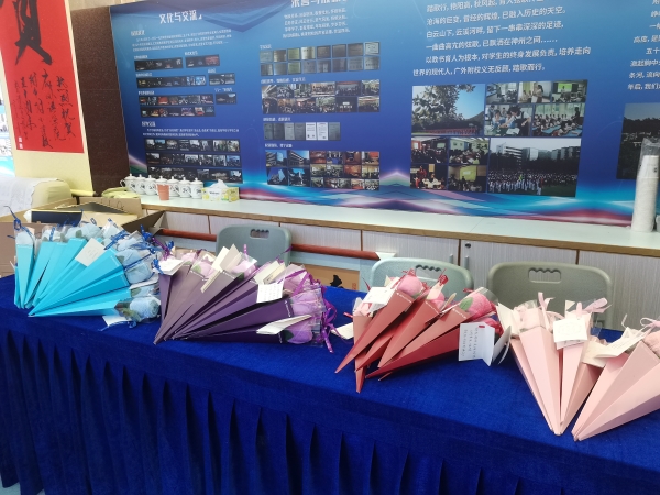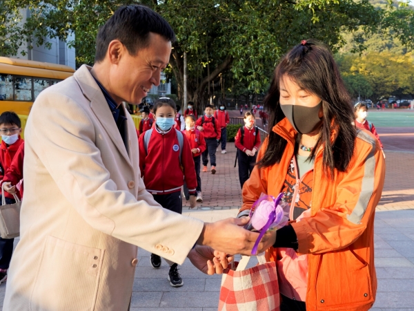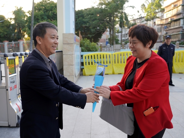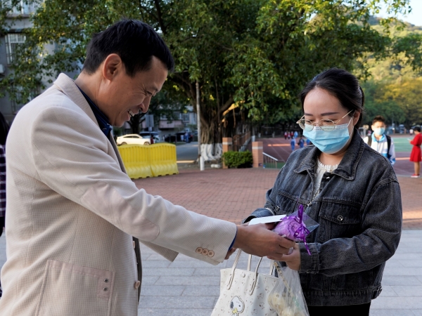 今天,伴随着白云山下丝丝的凉意,附校“男神”们一大早就在学校门口等待着给“女神”们送惊喜。方建军校长、涂筱辉书记、袁宇迪副校长给每一位附校“女神”教师送上节日的问候和诚挚的祝福,并亲手献上精致又实用的毛巾花。