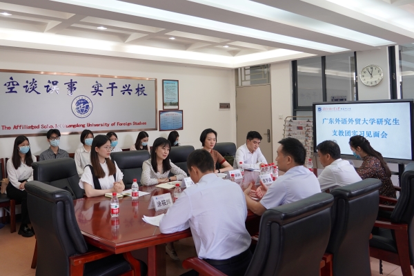 会上,袁宇迪副校长代表我校对广东外语外贸大学团委刘庆丹副书记、陈琳琳老师和实习生们的到来表示热烈的欢迎,袁校鼓励实习生们作为新生的年轻力量,要主动积极地把先进的想法融入到教学实践工作中,同时表示我校教师教学经验丰富,在指导过程中会加强交流与学习,把好的实践经验毫无保留的传授给实习生们。