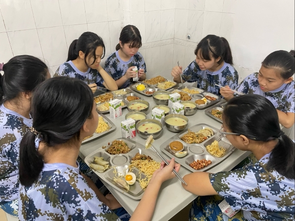 结束每半天的训练后,同学们有序地用餐。食堂饭菜口味多样,营养丰富均衡且色香味俱全,大家都吃得很开心。