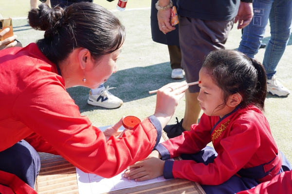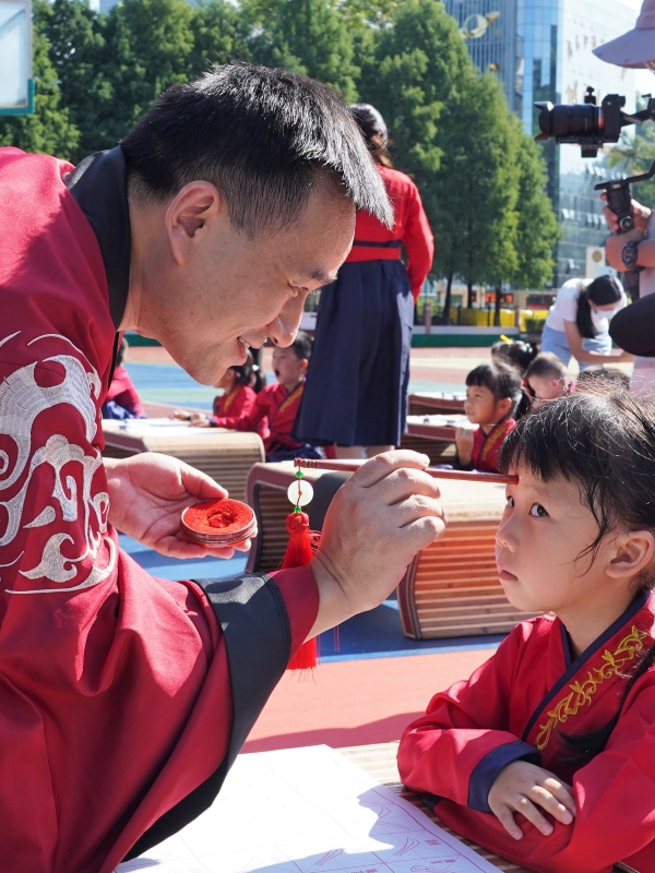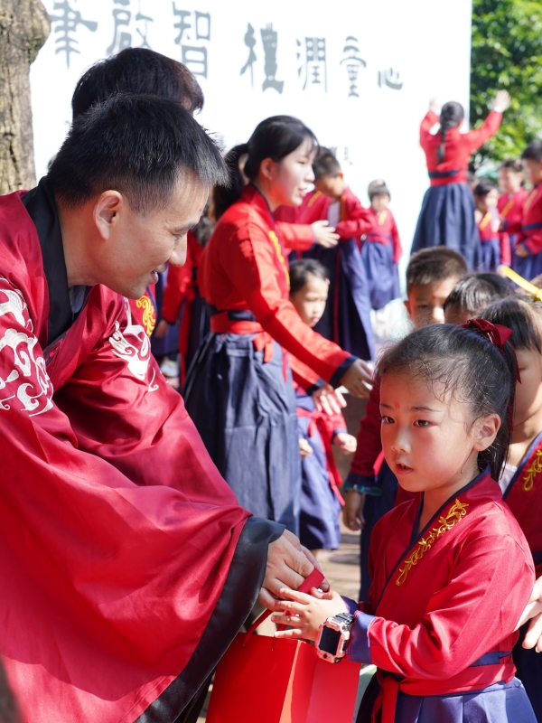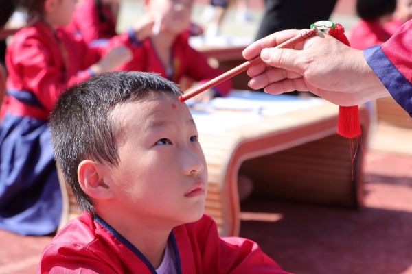 在古代,学童入学读书前,都会有启蒙师长用红色的朱砂在学子们的额头正中点上红痣,称为“开天眼”。领导和老师们手执朱笔,轻轻地在孩子们额头上点上一抹红色印记,点朱砂痣,寓意开启学童智慧,推开知识的大门,从此心明眼亮,勤奋读书,品行端正,健康成长。