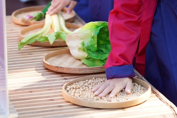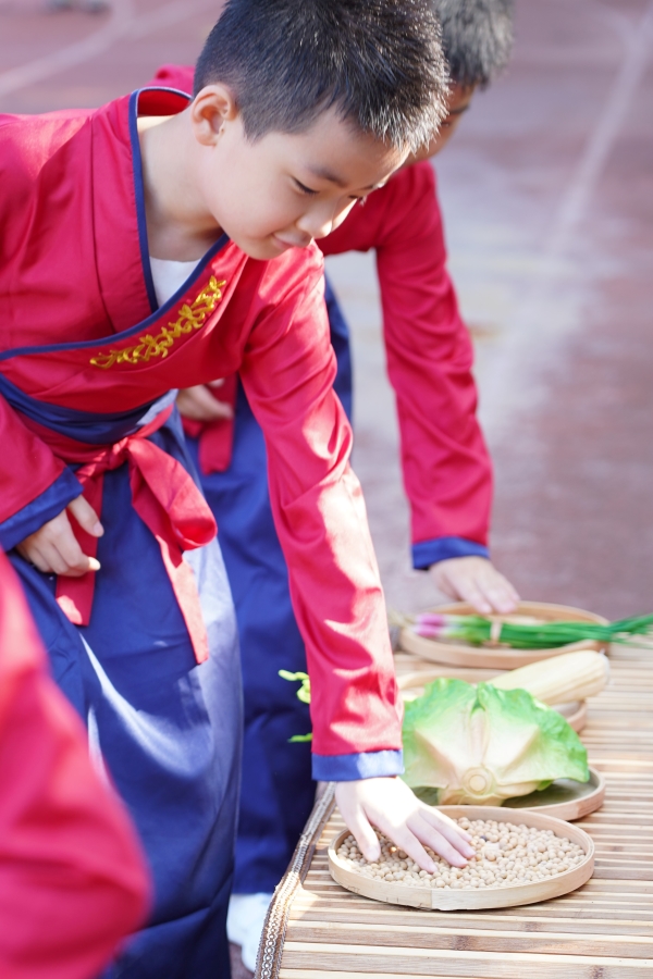 他们经过了五谷区,摸一摸五谷。寓意孩子们能在学习上大丰收,学到很多的知识。