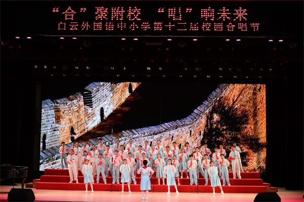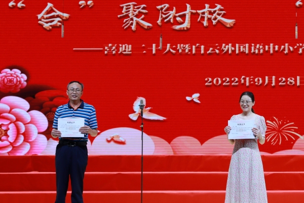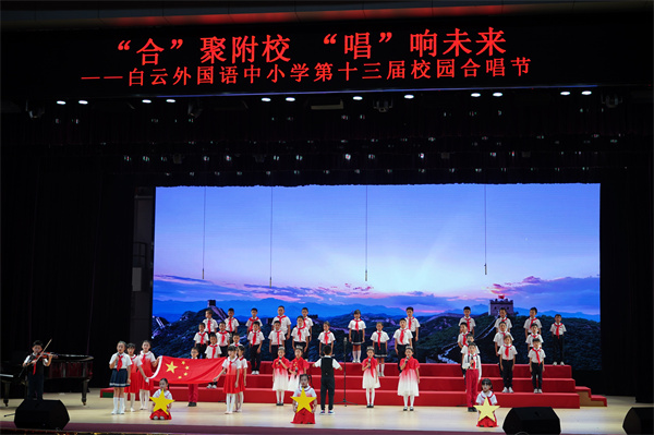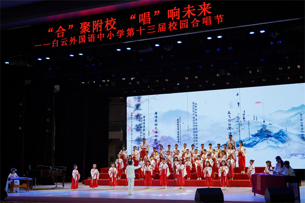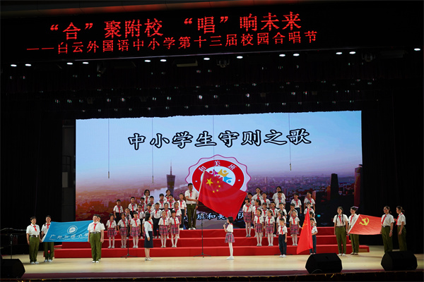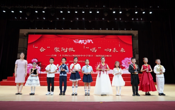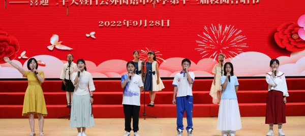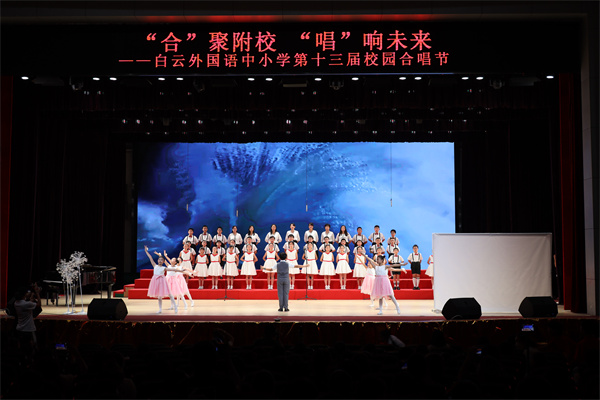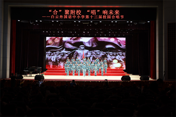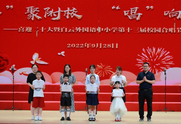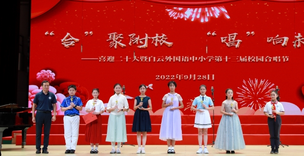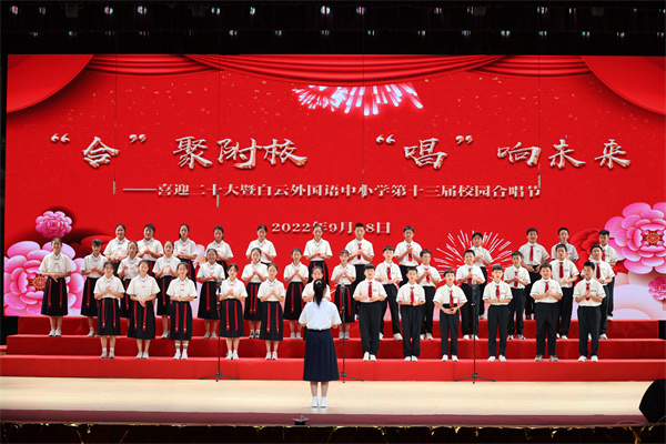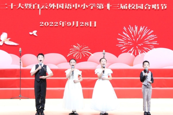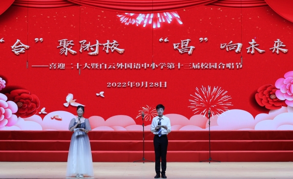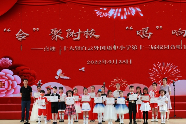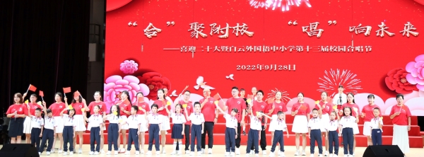 为迎接党的二十大胜利召开,庆祝中华人民共和国成立73周年,丰富校园文化生活,陶冶学生高尚情操,加强学生爱国、爱校、爱班教育,增强班级的凝聚力,推进我校活动育人的特色建设,2022年9月28日,我校在广外云山会堂举行了“合”聚附校,“唱”响未来 ——喜迎二十大暨白云外国语中小学第十三届校园合唱节。