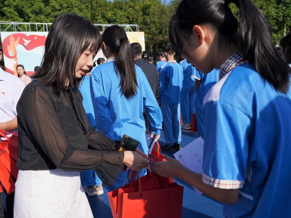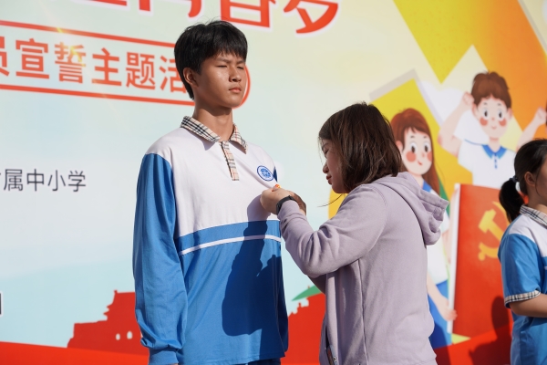 教师团员代表罗宇宏老师、何飞燕老师分别为新团员颁发团员证和佩戴团徽。