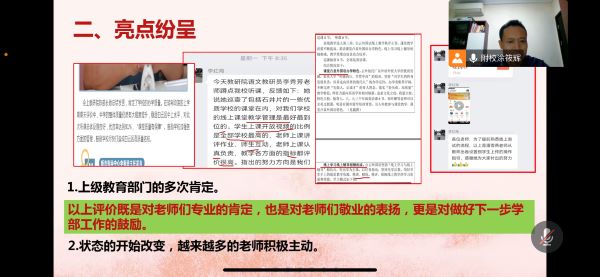 网课期间,各科老师都能及时调整好状态,有质量地完成课堂教学。副班主任们能够主动承担班会课,为班主任减负。需要改进的地方有:避免部分作业答疑时无监管,要提醒学生们在课堂答疑时间里打开摄像头,老师要实时提醒学生上课状态。提前进入课堂,不要出现空堂情况。备课组要提高集体备课的针对性,要整体把握各班之间教学进度及难度的差异。