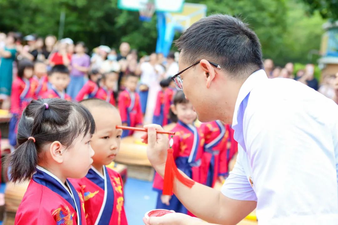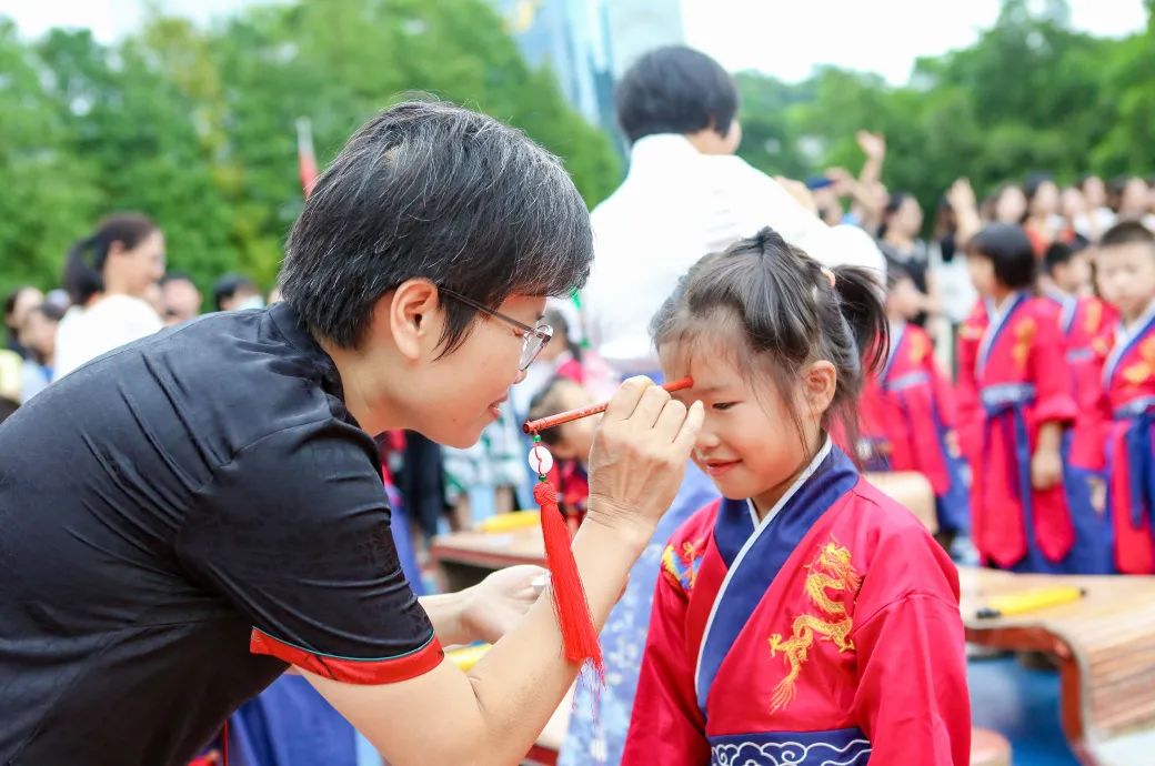 在古代,学童入学读书前,都会有启蒙师长用红色的朱砂在学子们的额头正中点上红痣,称为“开天眼”。领导和老师们手执朱笔,轻轻地在孩子们额头上点上一抹红色印记,点朱砂痣,寓意开启学童智慧,推开知识的大门,从此心明眼亮,勤奋读书,品行端正,健康成长。