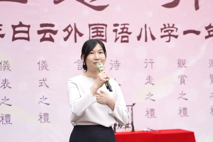 黄哲昙副校长欢迎三百多位小朋友加入白云外国语小学这个温暖的大家庭。她希望同学们能从庄重的开笔礼仪式中,真正感受到入学是人生中的一件大事,是开始学习走向成才的起点;希望以此激励同学们珍惜读书机会,崇德立志、勤学创新;希望同学们不仅要写好“人”字,还要学会做人,做一名遵纪守法、尊敬师长、热爱生命和德智体美劳全面发展的人。愿同学们通过今天的开笔礼,走出学习的第一步,走好人生的每一步!