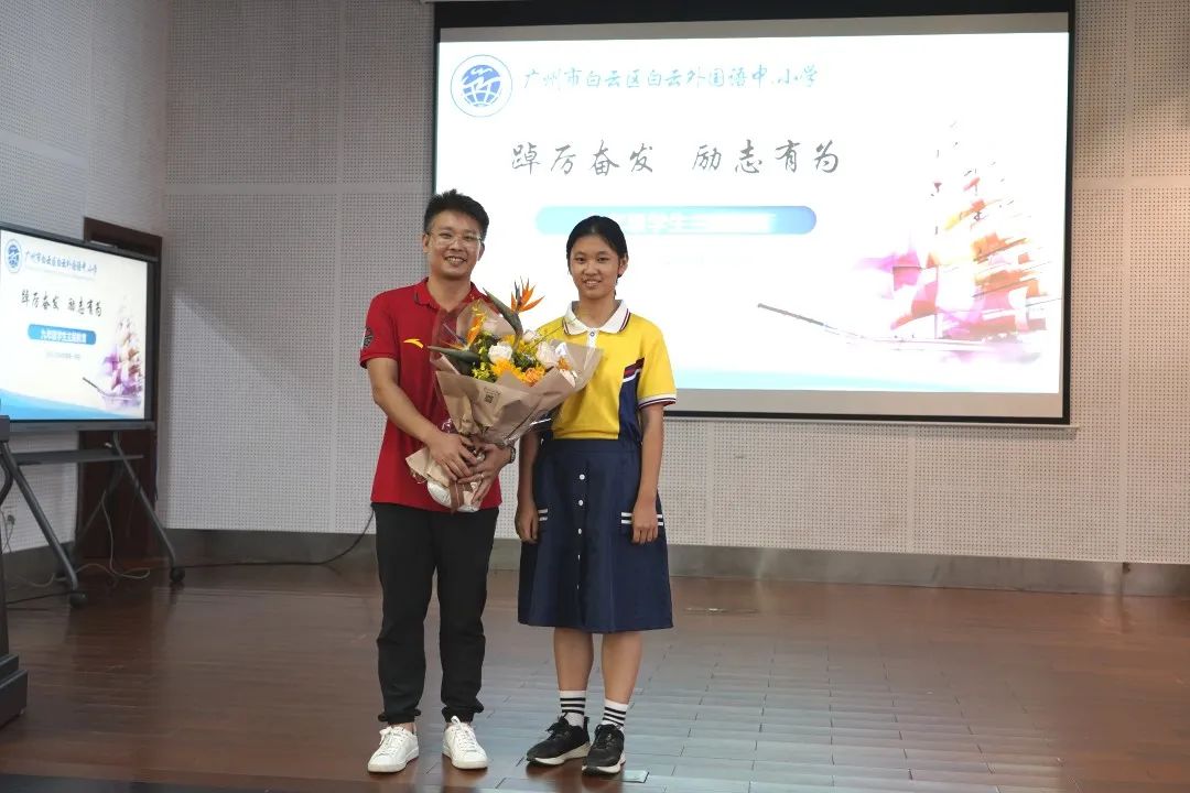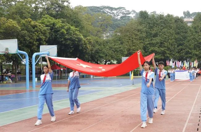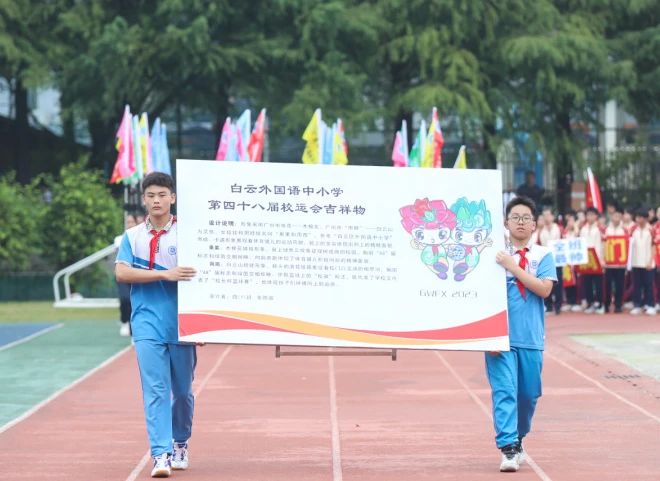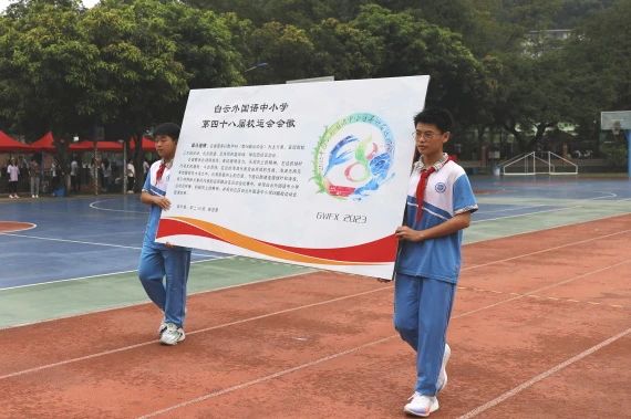 校旗是我们白云外国语中小学的象征,更是生机与活力的象征。她将激发健儿们的斗志,勇往直前、创造辉煌。