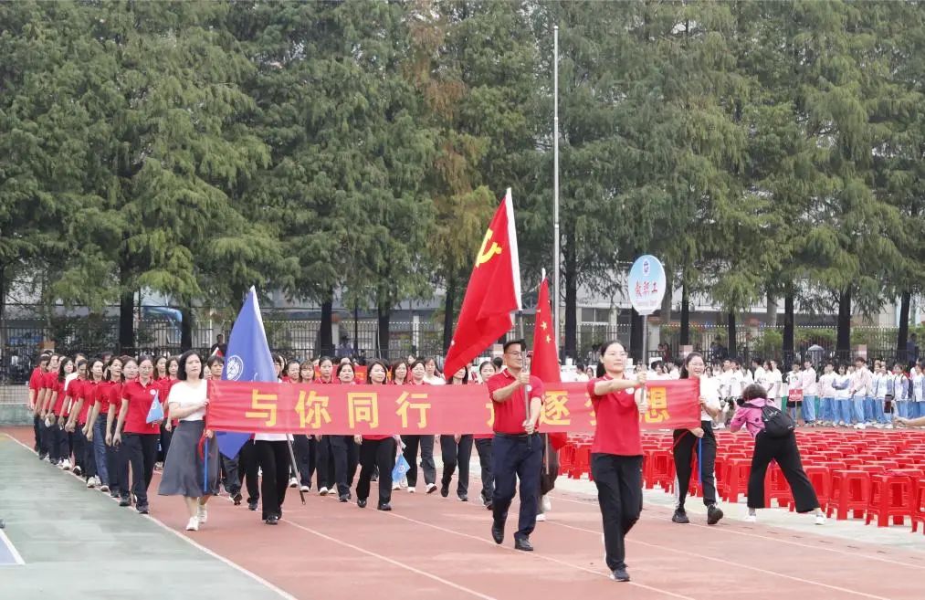 全体教职员工代表在方建军校长的带领下,迈着整齐的步伐,向主席台走来。他们是巧手的工匠,雕刻出一批批优秀的学子;他们是辛勤的园丁,浇灌出一代代娇艳的花朵。他们着装整齐,精神饱满,将为赛事保驾护航,并以公正、公平的原则去严格评判,展示友谊、团结、平等的体育精神。