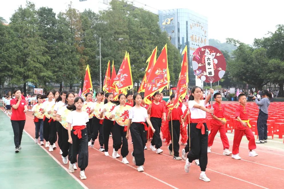 六年级方阵,他们用象征中国力量的觉醒雄狮、百变脸谱、古风诗词、鲜艳旗帜迎接校运会。青春在运动中勃发,团结在拼搏中彰显,我们期待少年们在赛场上谱写出他们的运动新篇章!