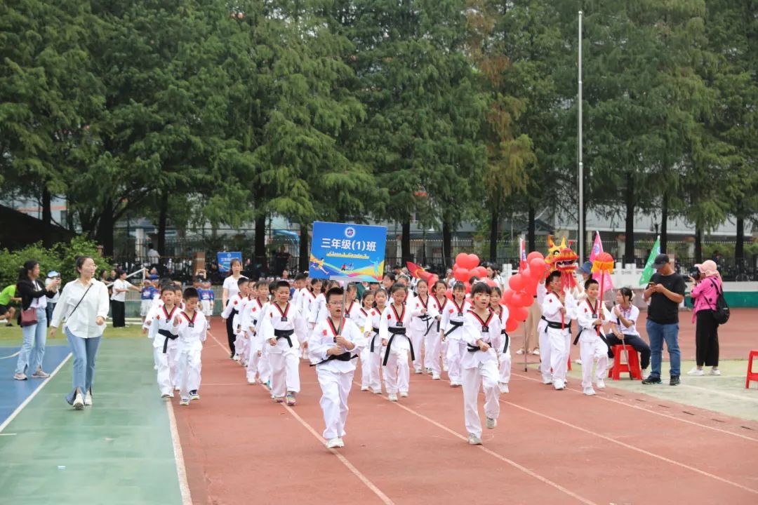 伴随着嘹亮的运动员进行曲以及各班级精心挑选的背景音乐,隆重而庄严的田径运动会开幕式缓缓拉开了帷幕。在国旗班、校旗队以及会微吉祥物、彩旗方阵的带领下,教职工方阵和全校48个班级方阵穿着各班特色、统一的服装,迈着整齐的步伐,喊着响亮的口号,精神饱满地走进会场接受检阅,并带来了独特又富有创意的表演。