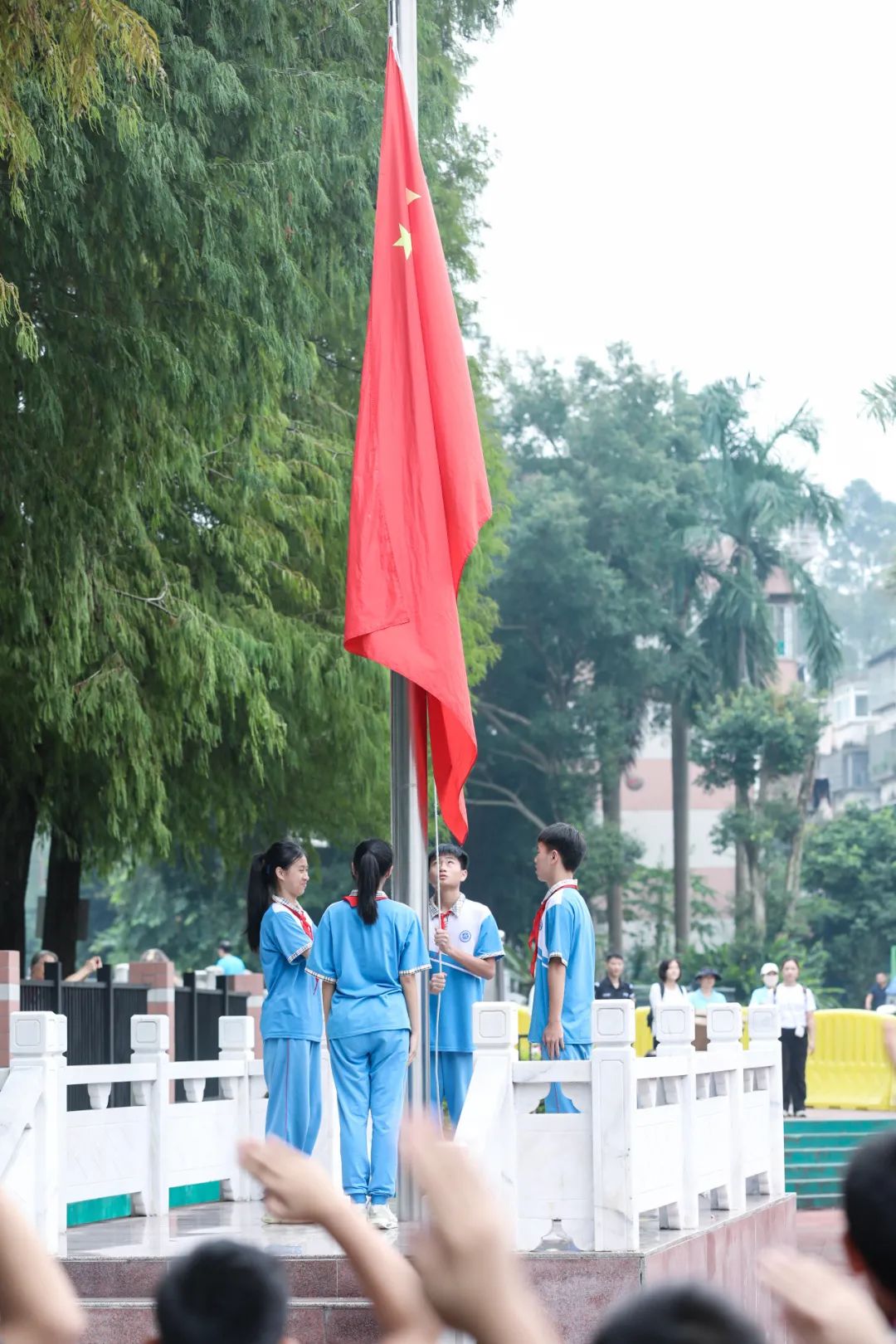 全体师生、嘉宾庄严肃立,在国歌声中仰望五星红旗冉冉升起。