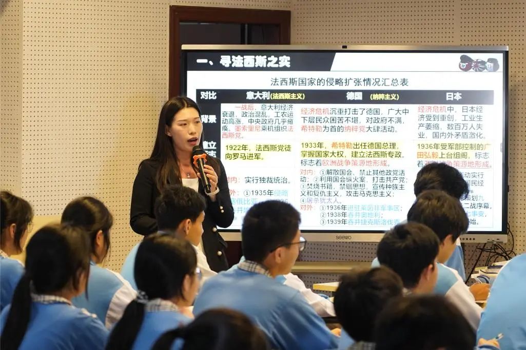 吴晓霞老师带来了一节历史课——《法西斯国家的侵略扩张》,吴老师的课堂是有温度的课堂,她的历史教学注重培养和提升学生的思维能力和对历史学习的探究精神。吴老师的课堂同时也是有广度的课堂,做到了学科融合和德育渗透。她将历史知识和时事相结合,衔接当代时事热点,如巴以冲突,教学发人深省,使学生认识到“同情、奉献”等人性的光辉不应该仅是一句口号,而是要真正树立起家国情怀,做到有责任、有担当。