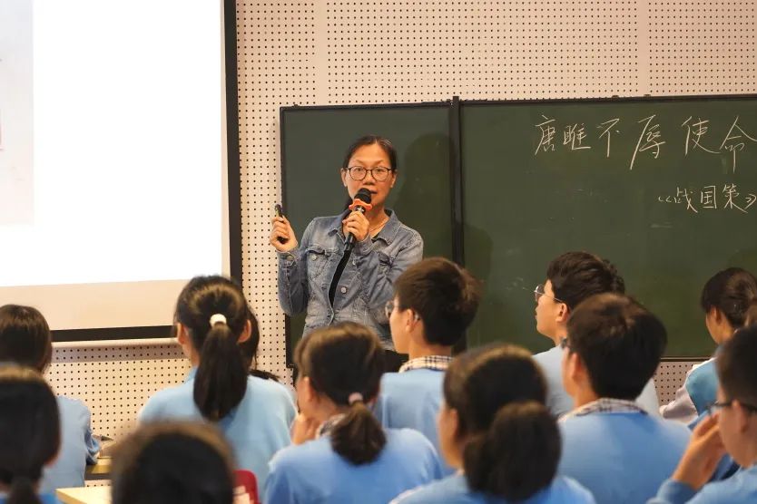 吴冠仪老师执教的是——《唐雎不辱使命》,授课时老师语态不急不慢,娓娓道来,双语结合,为学生搭好脚手架。科组互助,现场邀请初三语文科组雷老师上场助阵解释词句中“跪”的真实意义,是值得学习的创新方式。