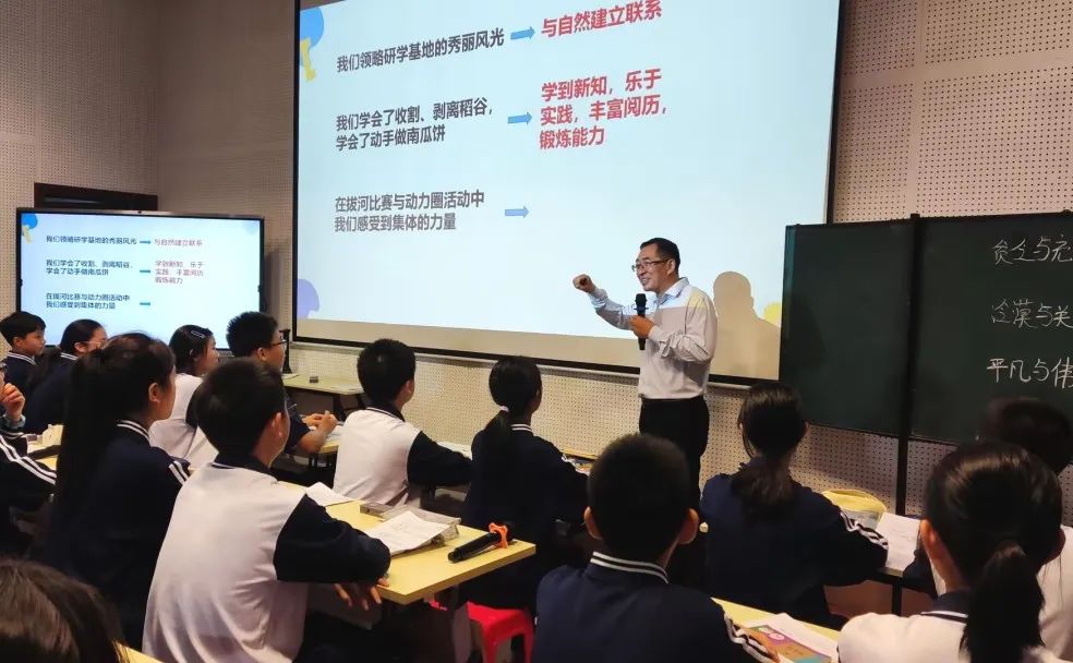 “两个基本点”,一是坚持依标施教,二是坚持体现人文性,教学素材选取生活化;体现开放性,目标的设定不仅仅限于教学内容的完成,而是学生整体素质的提高。问题的设计具有开放性,让学生有话可说。打造趣味性和思维力兼容的课堂。课堂上通过研学小视频等多样化的素材,做到了精导妙引。教学时语言精练,结尾让学生思考“如何让我们自己的生活在平凡中创造出伟大”,将教学小课堂带入社会大课堂。