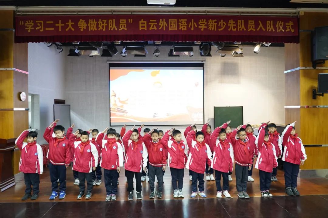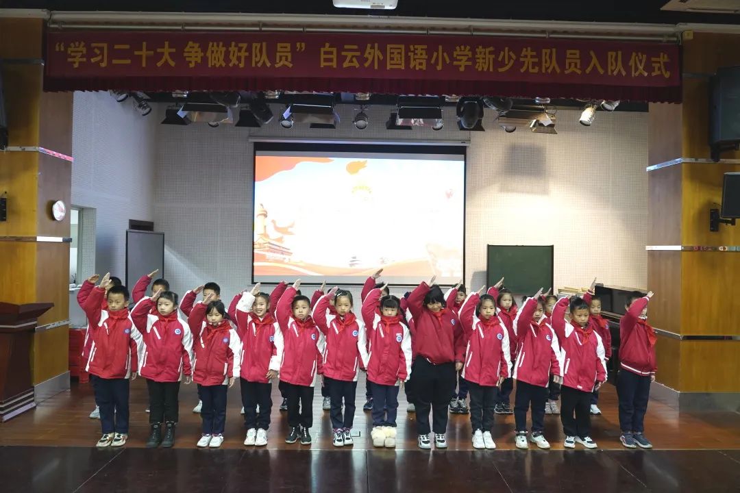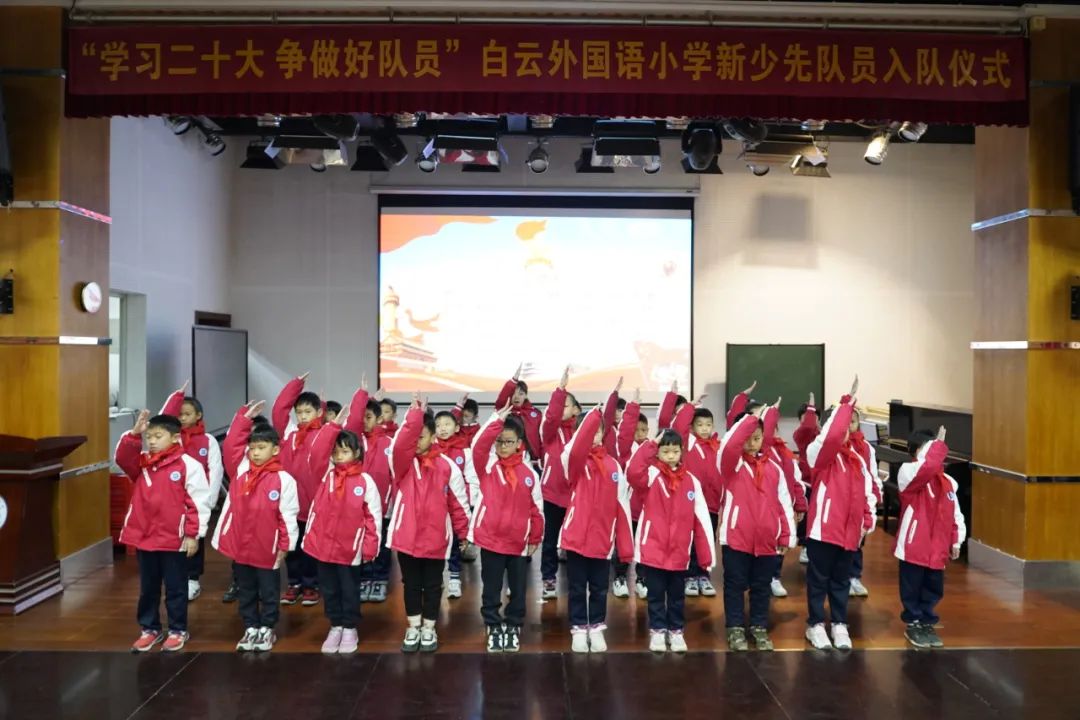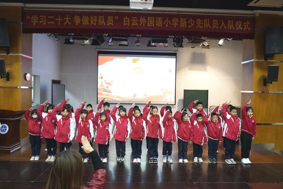 为深入贯彻落实习近平总书记关于少年儿童和少先队工作的重要指示精神,树立和增强少先队员的光荣感,12月20日白云外国语小学在学校礼堂举行了第二批少先队员的入队仪式,在少先队辅导员的带领下,在队旗的见证下,他们完成了人生中一次意义重大的、激动人心的仪式,正式成为了光荣的少先队队员。