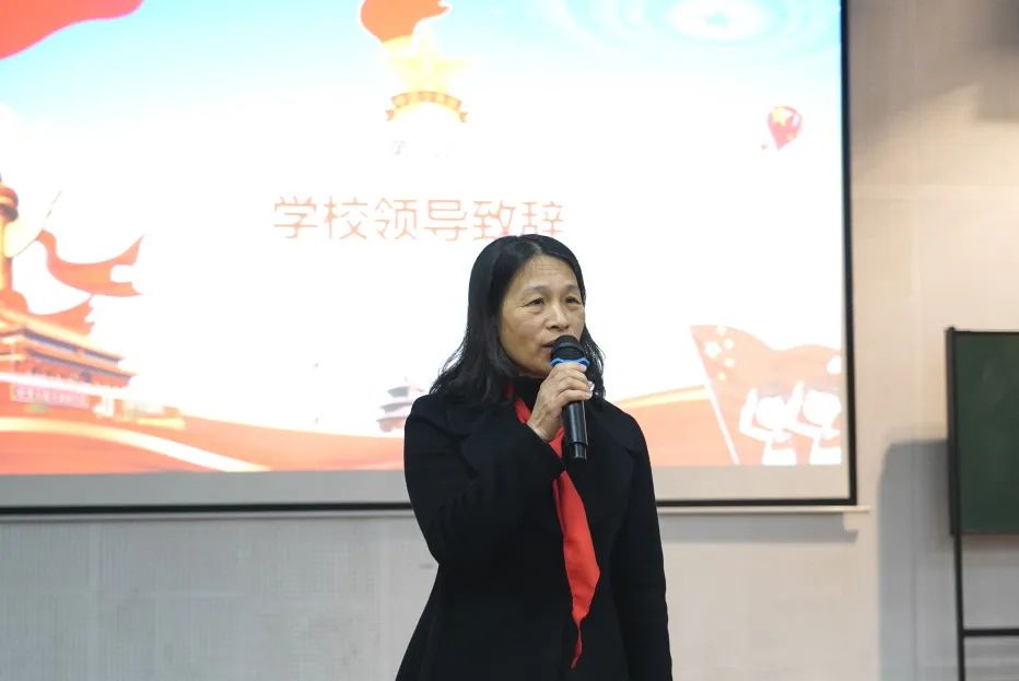 第四项黄哲昙副校长讲话,首先黄校对新队员表示祝贺,希望每一位少先队员爱惜红领巾,珍惜少先队员这一新的身份,争取成为德智体美劳全面发展的优秀少先队员。